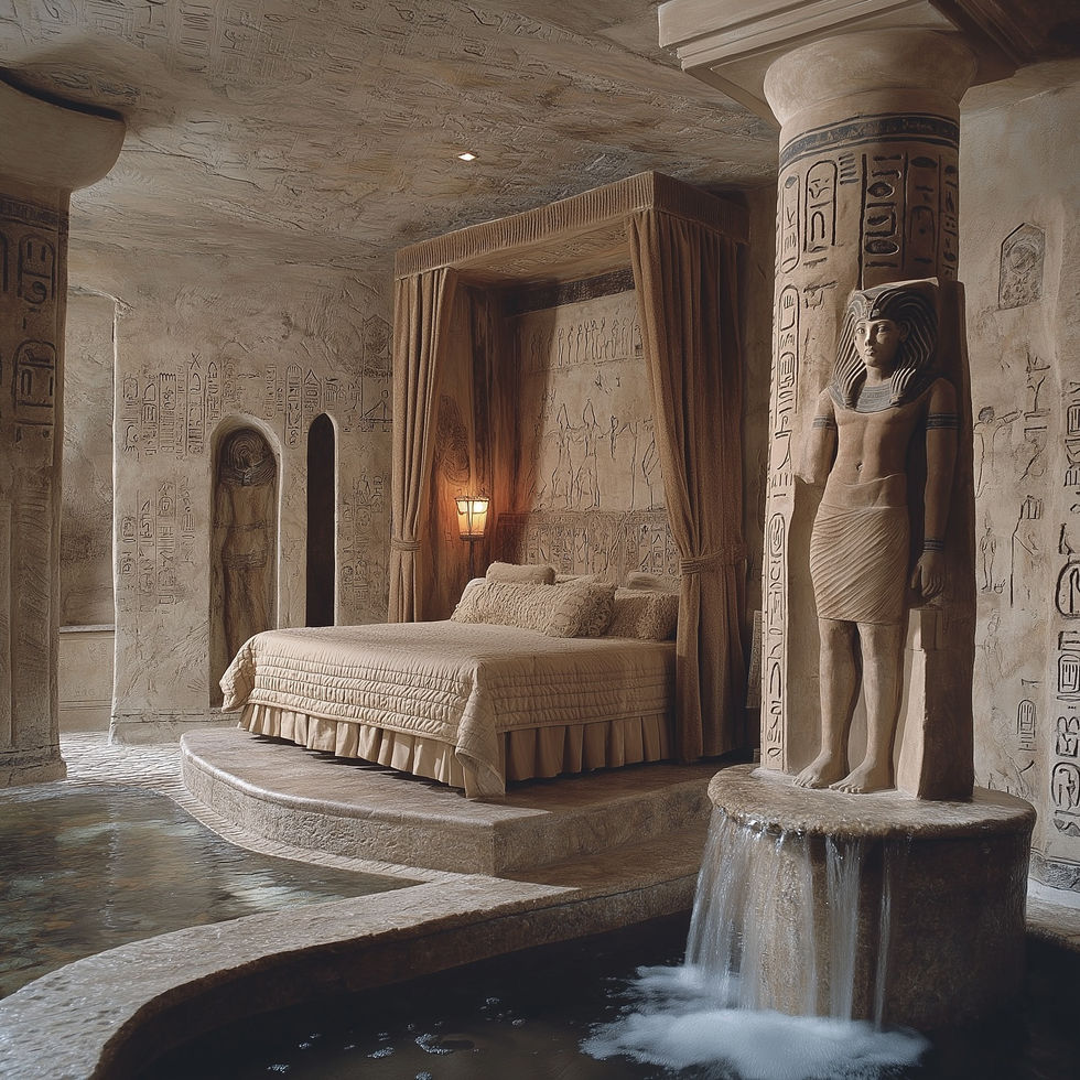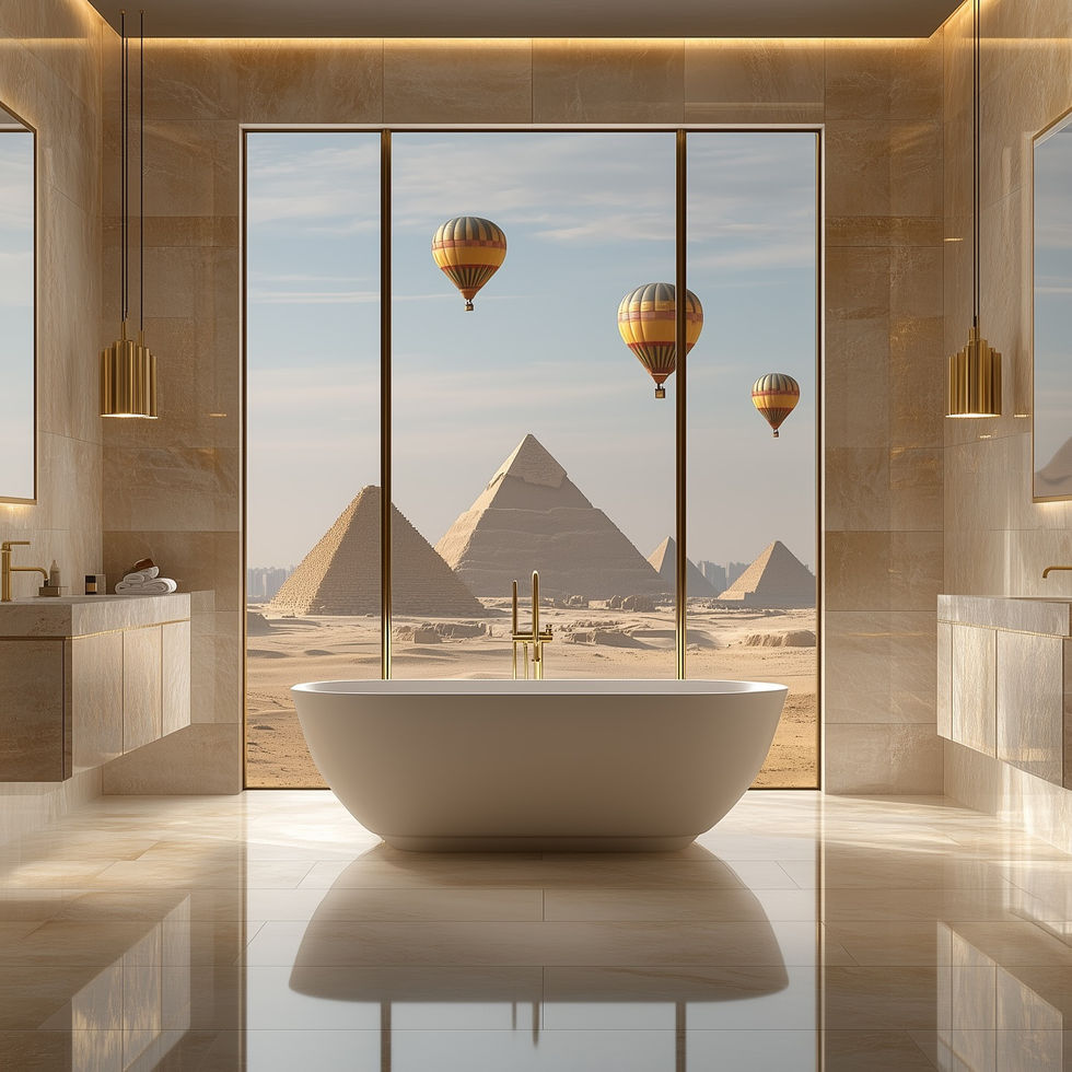 The villa’s limestone and marble interiors reflect the materials of ancient Egyptian monuments, while floor-to-ceiling windows frame breathtaking views of the pyramids and hot air balloons. The gardens feature symbolic plants like papyrus, honoring Egypt’s rich heritage.